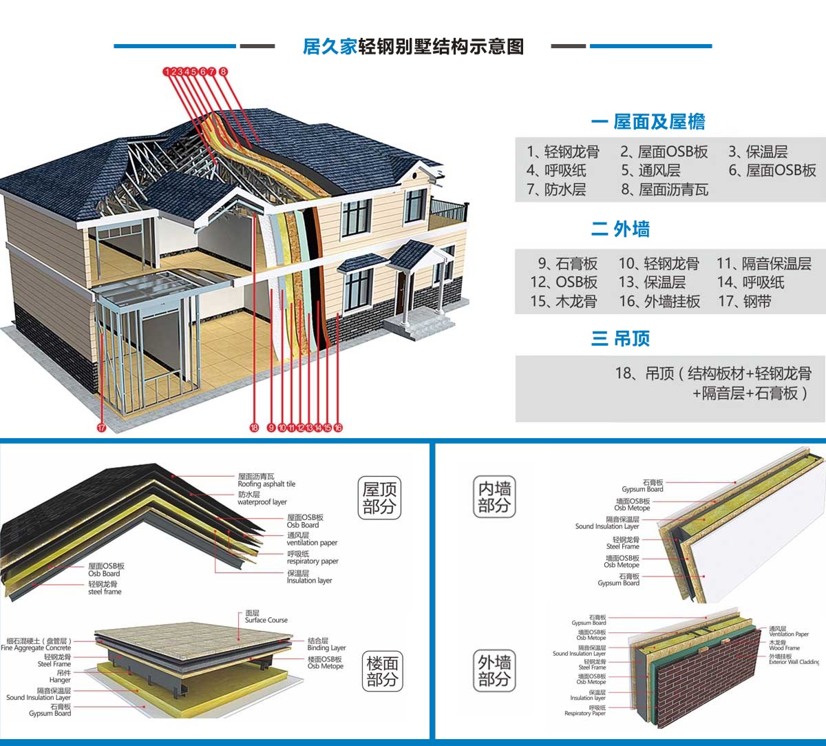 居久家輕鋼別墅隸屬于四川萬(wàn)建城建筑工程有限公司,集科研、設(shè)計(jì)、咨詢、加工、生產(chǎn)安裝為一體。一直致力于新型輕鋼結(jié)構(gòu)房屋的研究、開(kāi)發(fā)和應(yīng)用,倡導(dǎo)房屋建筑的設(shè)計(jì)和應(yīng)用在標(biāo)準(zhǔn)化、模塊化、通用化、規(guī)模化生產(chǎn)的同時(shí),實(shí)現(xiàn)人居環(huán)境的個(gè)性化、人性化、以及健康和舒適。 公司目前引進(jìn)具有國(guó)內(nèi)先進(jìn)水平輕鋼結(jié)構(gòu)房屋建筑技術(shù)和生產(chǎn)線,標(biāo)準(zhǔn)化、精細(xì)化和定制化設(shè)計(jì)、制造、安裝輕鋼結(jié)構(gòu)房屋。不僅能夠提供風(fēng)格各異的別墅建筑,同樣能夠提供行業(yè)標(biāo)準(zhǔn)的輕鋼樓宇建筑及建筑群。居久家裝配式房屋技術(shù)體系是高效節(jié)能型綠色建筑體系,各項(xiàng)建筑物理性能卓越,處于業(yè)內(nèi)先進(jìn)水平,能夠?yàn)榭蛻籼峁┤棠K化綠色建筑集成解決方案。